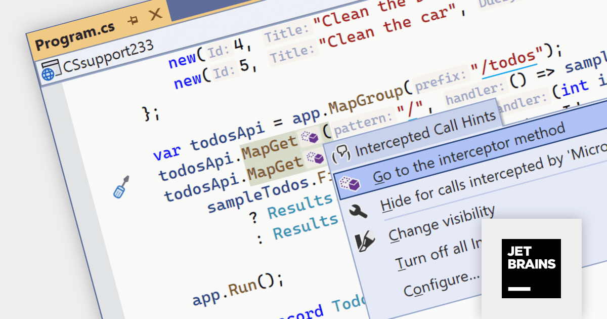 The ReSharper 2023.3 release improves C# 12 features with support for primary constructors, alias directives to reference any kind of type, collection expressions and interceptors. Eliminate repetitive field declarations and assignments by directly using primary constructor parameters within members. Constructor logic becomes more streamlined and focused, enhancing code clarity and maintainability. Easily transform existing classes and structs to leverage primary constructors, guided by ReSharper's refactoring capabilities.
