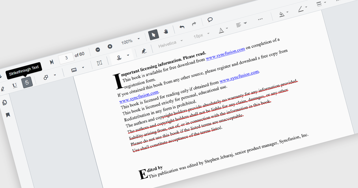Strikethrough annotations in a PDF viewer let users mark text for deletion while keeping the original content visible, helping teams review proposed edits in context. This supports clear collaboration without altering the source file and creates an audit trail for legal or editorial review. It enables fully digital, searchable workflows ideal for updating technical documents, refining contracts, or revising marketing content with accuracy and transparency.