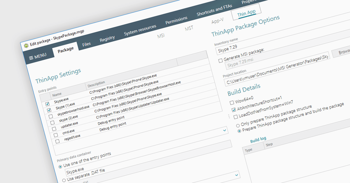 VMware ThinApp is an application virtualization solution designed to enable IT administrators to create portable and isolated versions of applications. It encapsulates applications along with their configurations and dependencies into a single executable file that can run independently from the underlying operating system. With support for ThinApp, an installation tool can be used to create and edit ThinApp packages directly within the authoring environment. Such an integration provides developers with a centralized management hub to streamline the deployment process of virtualized applications.