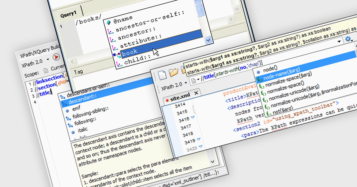 XPath auto-completion is a feature that enhances the efficiency and accuracy of traversing XML documents by predicting and suggesting possible XPath expressions as you type. This functionality makes writing XPath queries easier by reducing syntax errors and improving productivity, especially in complex documents. It aids in the rapid identification of relevant XML elements and attributes, ensuring precise targeting and extraction of data. By providing real-time suggestions, XPath Auto-completion minimizes manual effort and accelerates the development workflow, enabling developers to focus more on logic and less on syntax.