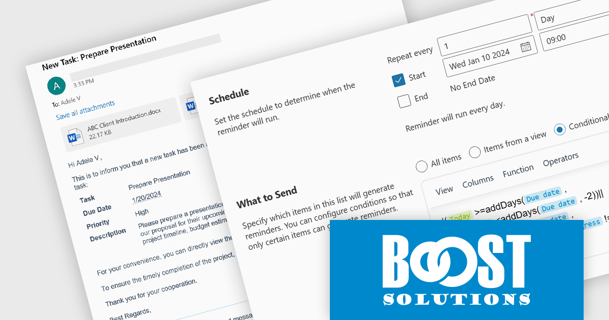 Alert Reminder App for SharePoint Online by BoostSolutions is an add-in designed to enhance communication and workflow efficiency within organizations using SharePoint Online. It enables the creation, management, and customization of alerts and reminders directly within the SharePoint environment, ensuring that users receive timely notifications based on their specific needs to keep them updated and on track with item changes and upcoming tasks.