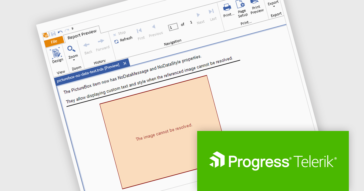 The Telerik Report Server 2024 Q4 update introduces enhanced handling for missing images in reports, providing greater control over how absent data is displayed. This is achieved through extended NoDataMessage properties, which allow developers to define custom messages or visuals that appear when data or images are unavailable. These enhancements improve the clarity and professionalism of report outputs, ensuring that users receive meaningful feedback even when expected content is missing. By addressing common disruptions caused by absent resources, the update helps developers maintain a seamless and polished reporting experience.