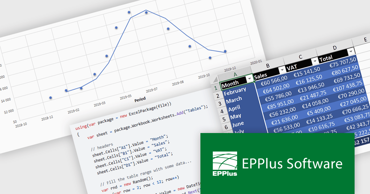 EPPlus is a powerful and versatile .NET library for managing and manipulating Microsoft Excel files using the Office Open XML (OOXML) format. It is a lightweight and efficient library that is easy to use and can be integrated into a wide range of applications. It allows developers to create, read and modify spreadsheets without dependencies on any other library. Features include pivot tables, styling, VBA/Form controls, conditional formatting, charts, tables, formula calculation, data validation, pictures/shapes, and more.