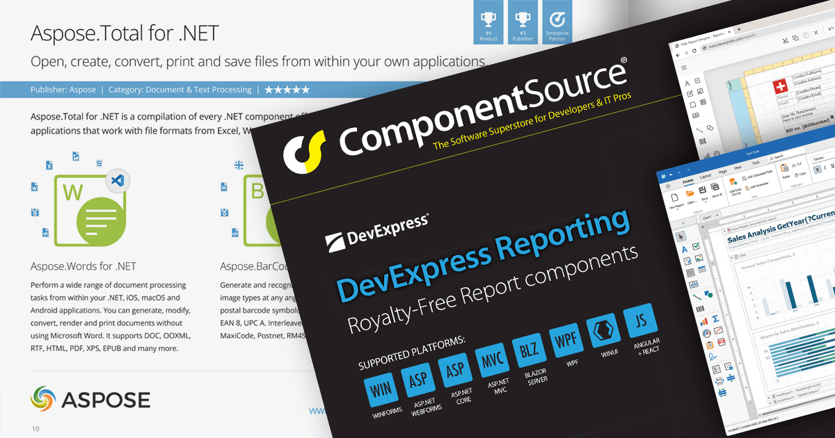 Products include file format APIs, reporting solutions, User Interface controls for .NET and JavaScript, communications components, and much more.