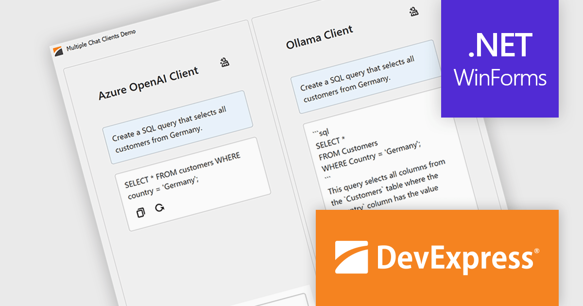 The DevExpress WinForms 25.2 update introduces multi-provider support in the AI Chat Control, allowing developers to integrate several AI services into one application. This enables advanced use cases such as side-by-side comparison of responses from different AI models, concurrent sessions with independent chat histories, and dynamic switching between providers during runtime. It’s especially useful in environments where evaluating model performance or offering user choice is essential, such as customer support tools, research platforms, or development sandboxes.