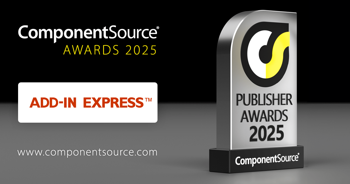 Congratulations to Add-in Express on winning a Top 100 Publisher Award in the annual ComponentSource Awards for 2025. We're pleased to once again recognize Add-in Express's ongoing excellence in developing Office add-ins.
