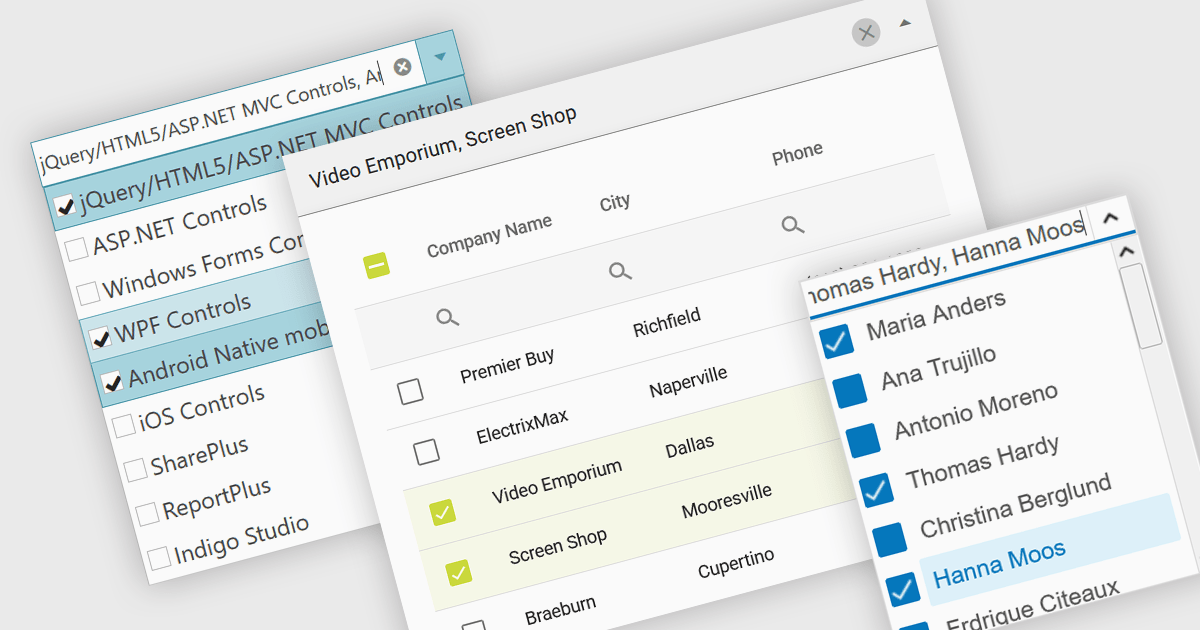A checked combobox is a data editor component used in user interfaces that consists of a text box with a drop-down panel. This panel displays a predefined list of items, in a clean and organized layout, from which users can input data by making a singular or multiple selections using the adjacent checkboxes. The values are then typically displayed as a comma-separated summary in the collapsed field. This type of control provides developers with a convenient way to implement multi-select functionality within their applications, and is especially effective in scenarios such as filtering datasets or configuring settings, without consuming additional space on the interface.