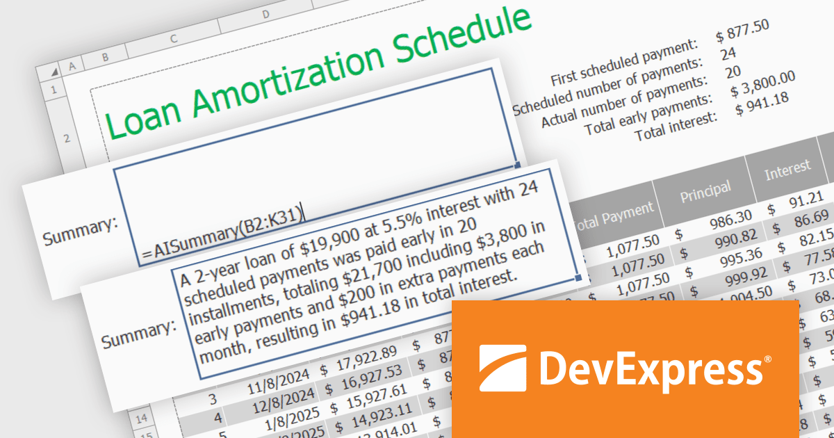 In this blog post, DevExpress's Maria Nikulina shows you how to integrate OpenAI services with the DevExpress WinForms Spreadsheet Control (included with DXperience) to implement user-defined formulas for advanced calculations. These formulas let you automate repetitive tasks, efficiently analyze data, and execute advanced calculations not possible with built-in functions.