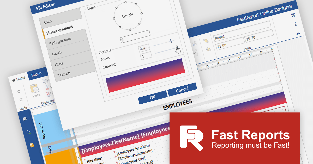 FastReport Online Designer 2024.1 adds new design features which give users a wider choice in styling the reports they create. The new options include linear gradient, shape gradient, hatch fill, glass fill, and and texture fill. Linear gradients smoothly blend two colors, and shape gradients can be used to create unique and eye-catching effects. Hatch fills add texture to otherwise plain backgrounds, and glass fills create transparent effects. Users can apply these styles to both objects and bands, giving them more control over the appearance of their reports.