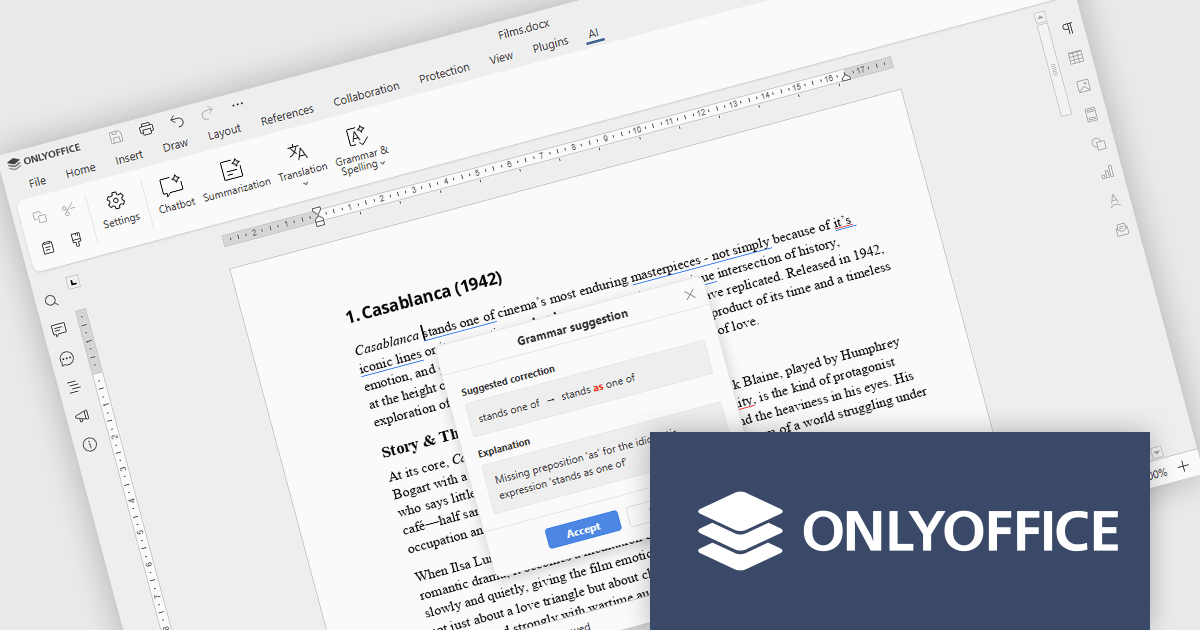 The ONLYOFFICE Docs v9.2 update integrates AI-powered spell and grammar checking, now available directly through the AI plugin, so developers can review and refine documentation without leaving their editing environment. This reduces the time spent on proofreading and eliminates the need to rely on separate tools or browser extensions for basic language quality checks. As a result, development teams can keep their documentation professional and easy to understand while staying focused on implementation, code quality, and delivery timelines.