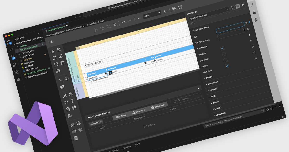 A Visual Studio integrated report designer lets developers create and edit report layouts directly inside the Visual Studio IDE, instead of using a separate reporting tool. Report definitions live alongside application code, data models, and resources, improving integration, maintenance, and use of source control and CI/CD. Developers work in a familiar environment with drag-and-drop layout design, property grids, and IntelliSense-backed expressions, plus the option to add custom logic in C# or VB. Typical use cases include interactive sales dashboards, operational reports, and audits where teams must quickly iterate, bind live data, and preview results.