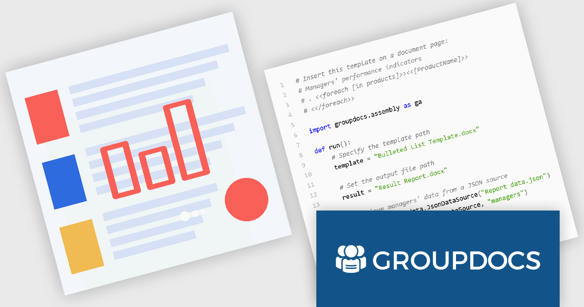 GroupDocs.Assembly for Python via .NET is a powerful document automation library designed to facilitate the dynamic creation of documents from templates. Built on the robust GroupDocs.Assembly engine, this Python-compatible solution leverages the .NET framework to enable developers to programmatically populate documents such as Word, PDF, Excel, and PowerPoint files using structured data sources. By integrating with popular file formats and maintaining high fidelity in output, it supports a wide range of document automation scenarios within Python applications.
