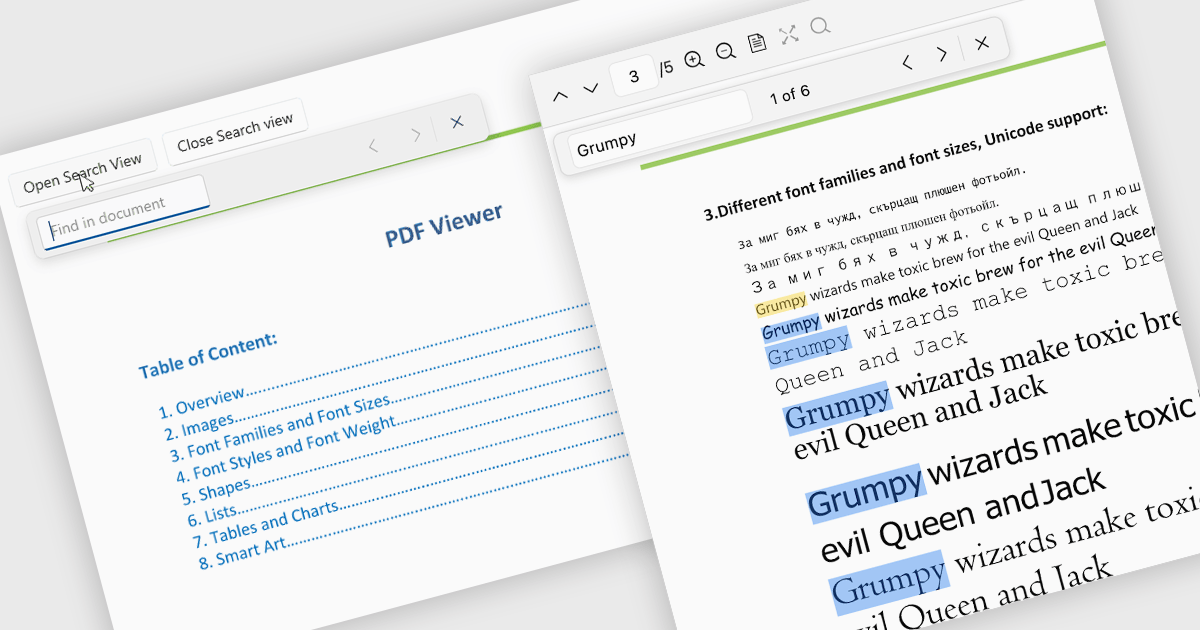 Search in a PDF viewer allows users to quickly locate specific words, phrases, or data within a document without manually scanning each page. By instantly highlighting and navigating between results, search makes it easier to work with large or complex PDFs such as reports, manuals, contracts, or research papers. This functionality improves productivity by helping users find relevant information faster, understand content in context, and move directly to important sections.