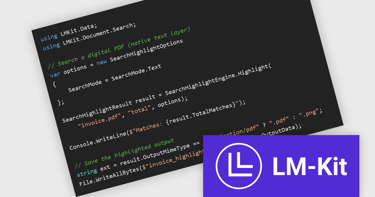 The LM-Kit.NET 2026.3.2 update introduces the SearchHighlightEngine, a new feature that enables applications to search and visually highlight text within paginated documents such as PDFs or images. It supports exact matches, regular expressions, and fuzzy matching using the Damerau–Levenshtein distance, allowing developers to locate text even when small spelling variations or recognition errors are present. The engine produces a highlighted version of the document, making results immediately visible and easier to review in document processing, analysis, or verification scenarios. It can also accept pre-computed PageElement instances for raster PDFs or images, allowing existing layout or text extraction results to be reused and reducing the processing required to add search highlighting capabilities.