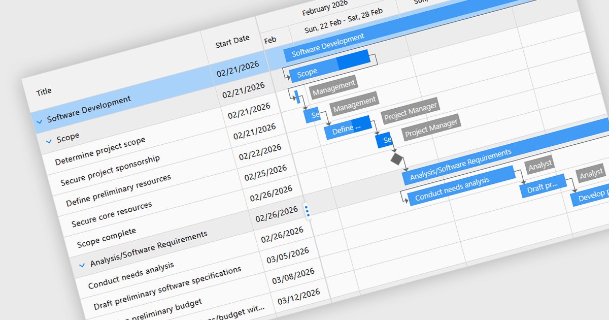 Gantt controls in ASP.NET Core UI suites are specialized components used to visualize and manage project schedules within web applications. They present tasks along a timeline in a Gantt chart format, showing start and end dates, task dependencies, progress, and resource allocation in a clear graphical view. Developers can integrate these controls to provide features such as task hierarchy, drag-and-drop scheduling, dependency linking, milestone tracking, and interactive editing directly in the browser. Many implementations also support data binding to backend services, filtering, and export capabilities, making them suitable for project management systems, planning tools, and enterprise dashboards where users need to monitor timelines and coordinate complex workflows efficiently.