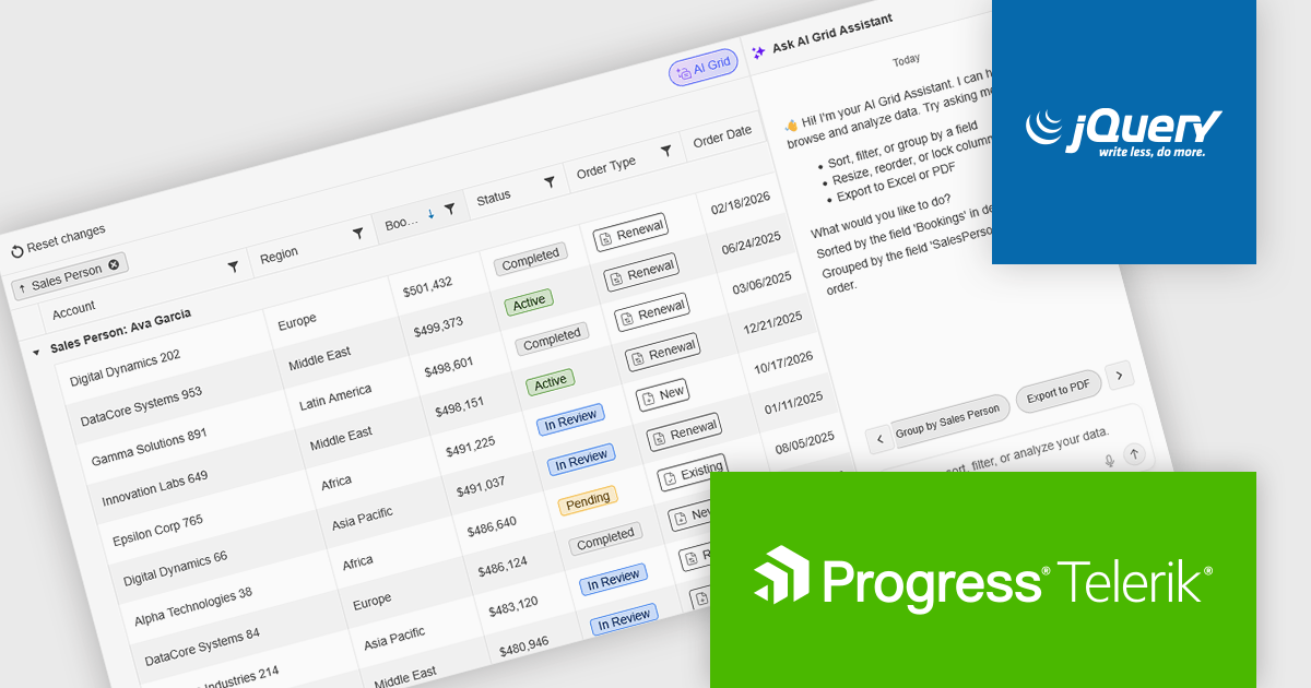 The Kendo UI for jQuery v2026 Q1 update introduces AI Chat integration for the Smart Grid, enabling developers to incorporate a conversational interface into data-driven web applications. End users can explore and query structured Grid data using natural-language input, while the integration leverages the Grid’s schema, configuration, and current view to generate precise, context-aware responses. This approach minimizes the need for complex filtering configurations and custom-built query tools, reduces user training requirements, and enhances overall usability. For development teams, it improves implementation while delivering a more efficient and accessible data exploration experience within existing jQuery applications.