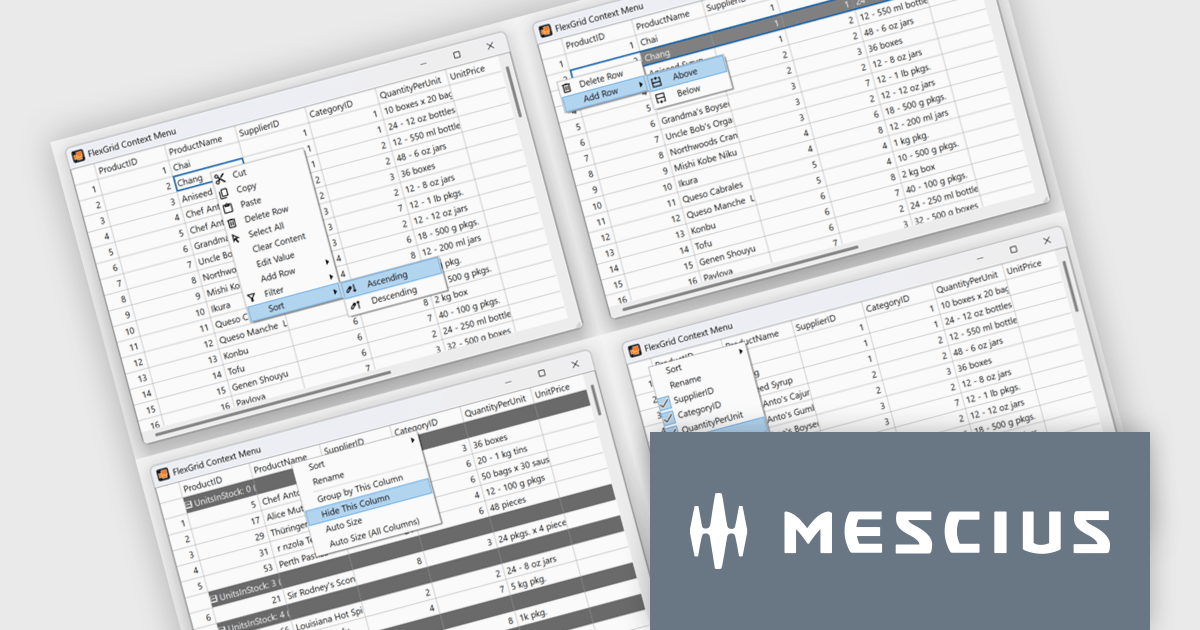 The ComponentOne 2025 v1.2 update includes a new sample demonstrating a complete, custom context menu solution for FlexGrid. It allows developers to define context-aware actions that adapt to different parts of the grid. This enables right-click functionality to insert rows, sort or group columns, and open a column picker directly within the grid. Developers benefit from the flexibility of FlexGrid’s API to implement tailored solutions while providing end users with a familiar, Excel-like experience that enhances efficiency and precision in data management tasks.